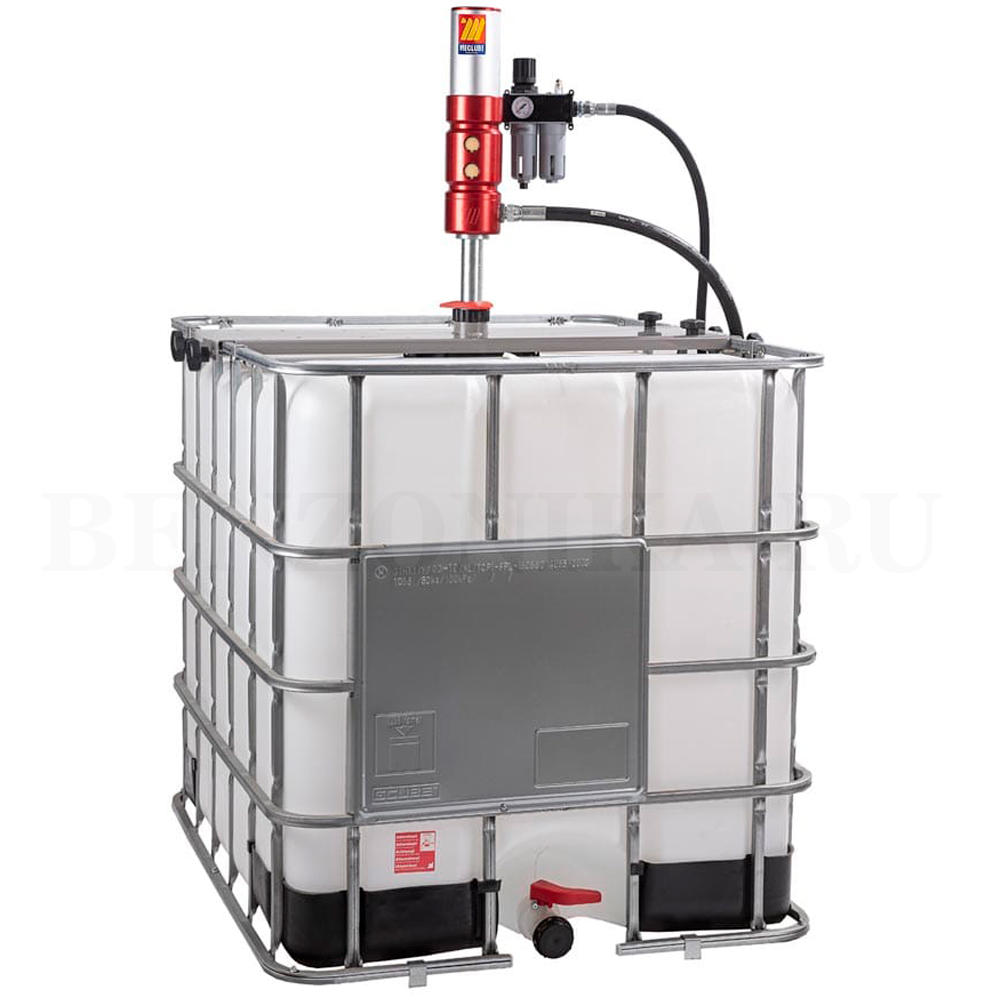 Комплект Meclube 022-1892-000 для раздачи масла, с креплением пневматического поршневого насоса на монтажный кронштейн установленный сверху IBC-контейнера. Комплект предназначен для выкачивания/раздачи масла из ёмкостей IBC объемом 1000 литров.