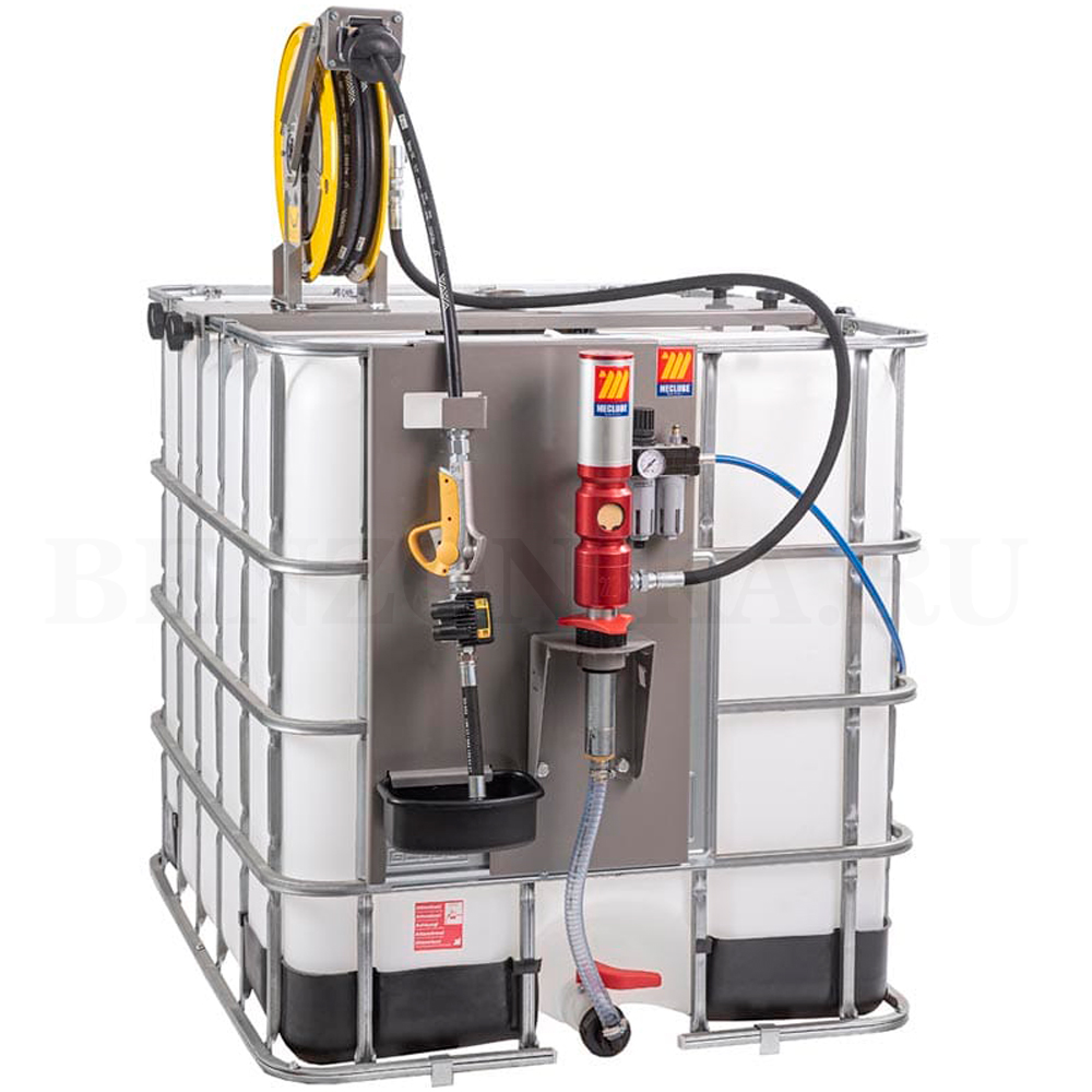 Комплект Meclube 022-1903-000 для раздачи масла, с креплением пневматического поршневого насоса на монтажный кронштейн сбоку IBC-контейнера, катушка установлена сверху ёмкости. Комплект предназначен для выкачивания/раздачи масла из ёмкостей IBC объемом 1000 литров.
