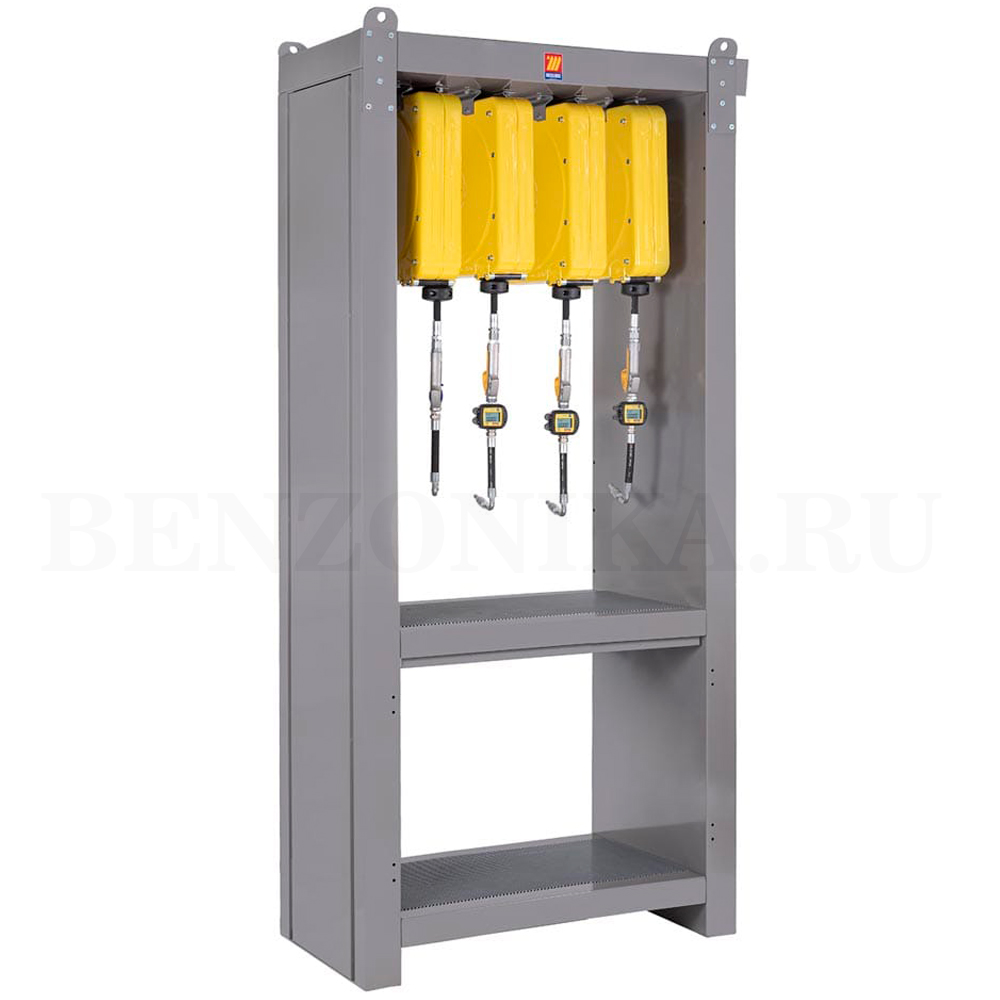Каркасная опора (стойка) для шланговых катушек предусматривает установку до 4-х катушек серии F-400, F-460 или CF-500. Опора изготовлена с поддоном для сбора случайных разливов и столешница с решеткой.