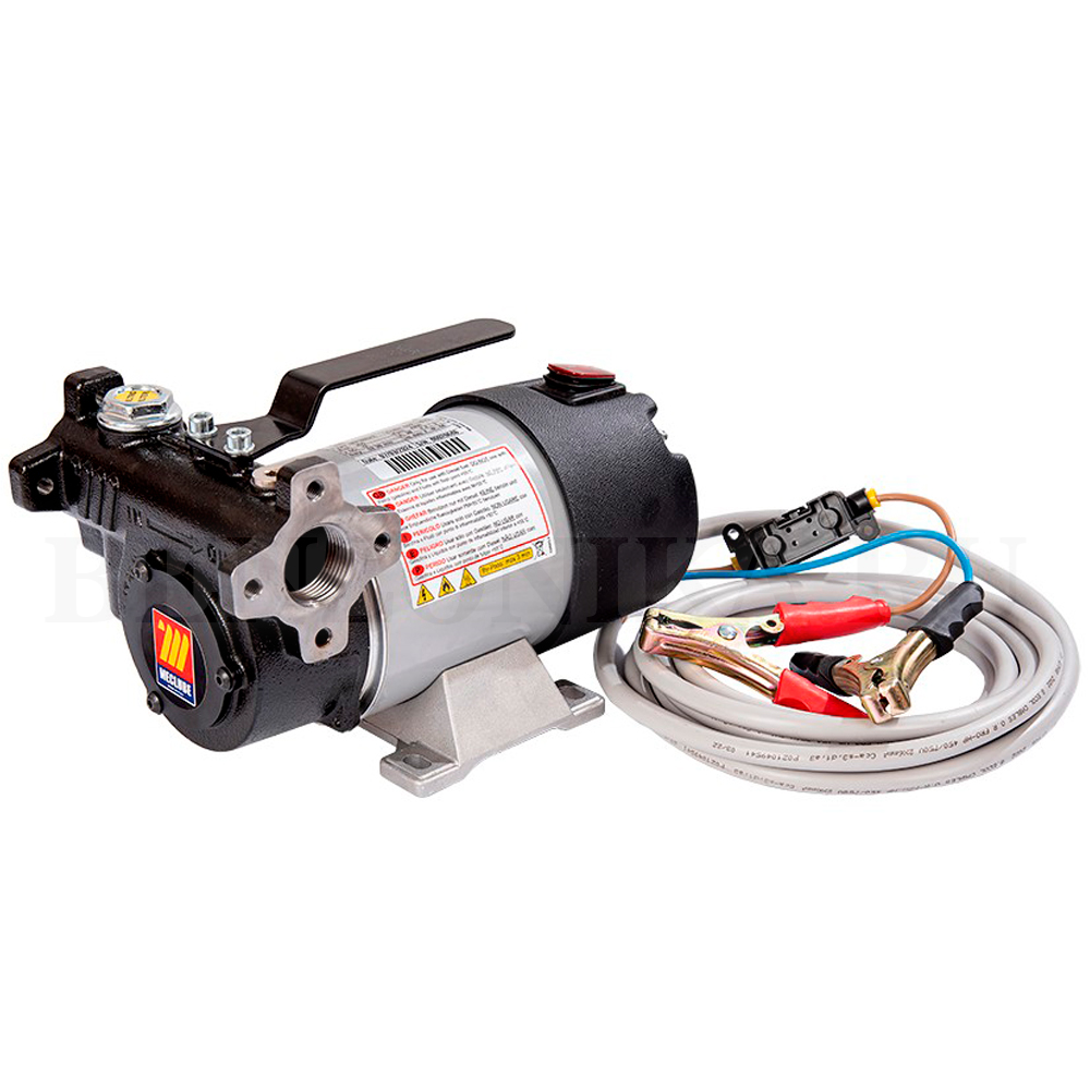 Электрический самовсасывающий насос с аккумуляторной батареей, питание от сети 12В, корпус из чугуна, рабочее колесо из спеченной стали и лопасти из ацетиловой смолы. Встроенный перепускной клапан и фильтр из нержавеющей стали.
