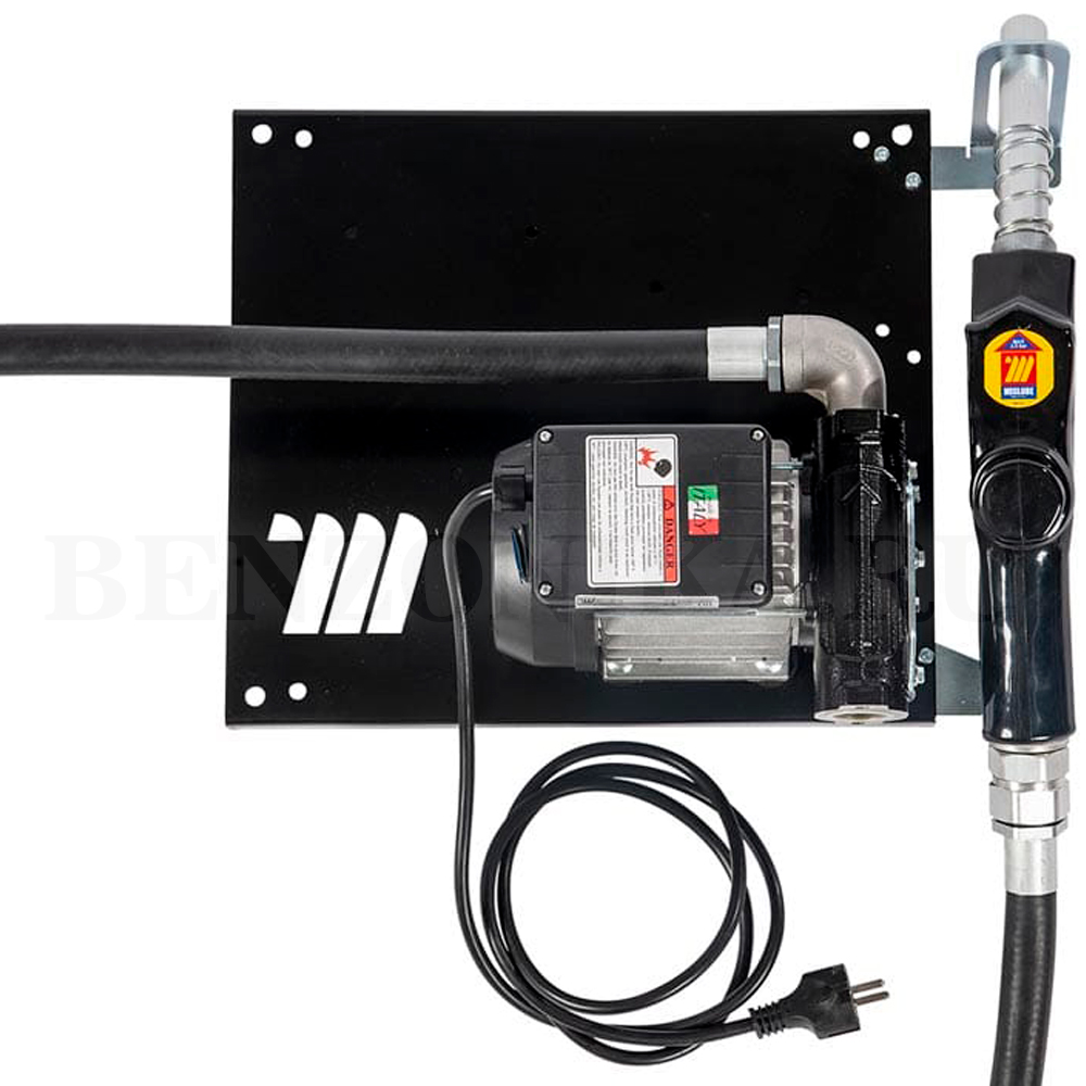 Заправочный блок (Настенный узел "COMPACT" Meclube 090-5043-070), оснащённый насосом 220В производительностью 70 л/мин, установленный на металлической пластине для удобного монтажа на стене. В комплектацию входят антистатический шланг для выдачи дизельного топлива и автоматический топливораздаточный кран.