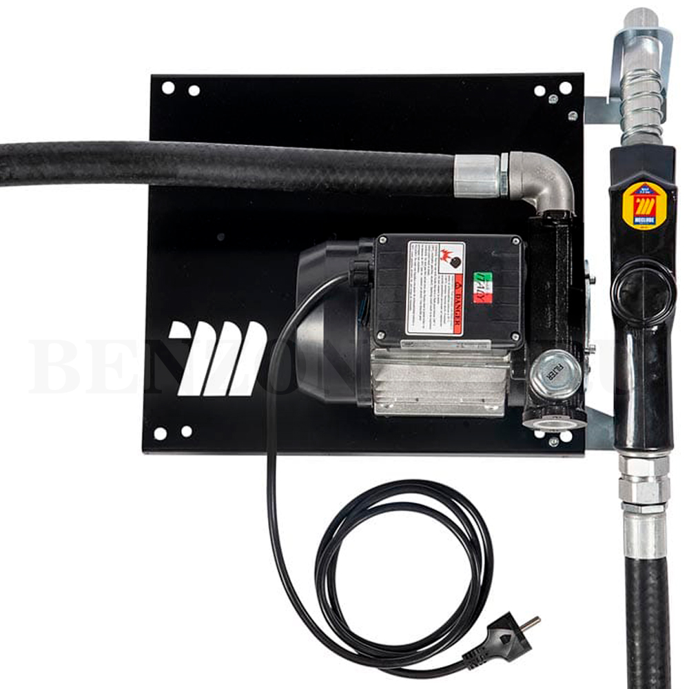 Заправочный блок (Настенный узел "COMPACT" Meclube 090-5043-100), оснащённый насосом 220В производительностью 100 л/мин, установленный на металлической пластине для удобного монтажа на стене. В комплектацию входят антистатический шланг для выдачи дизельного топлива и автоматический топливораздаточный кран.