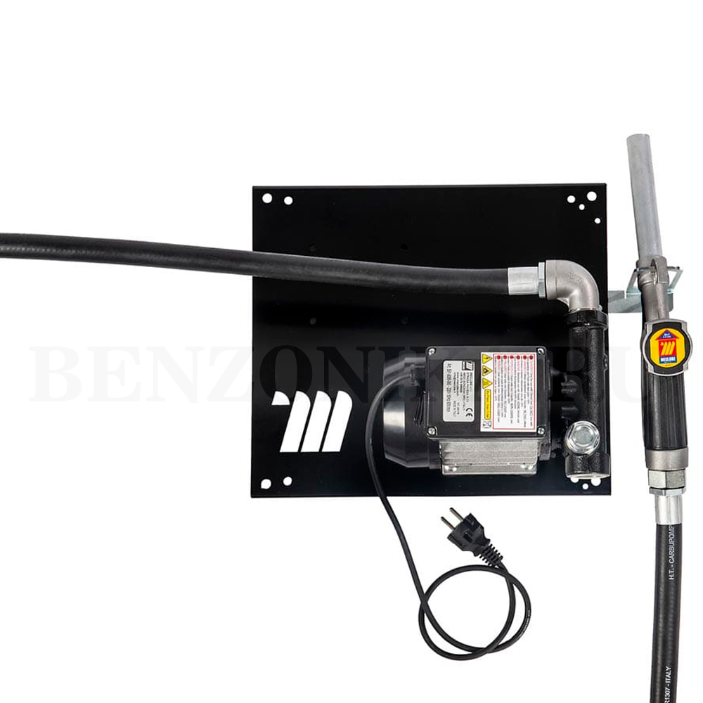 Заправочный блок, оснащённый насосом 220В производительностью 60 л/мин, установленный на металлической пластине для удобного монтажа на стене. В комплектацию входят также антистатический шланг для выдачи дизельного топлива и ручной топливораздаточный кран.