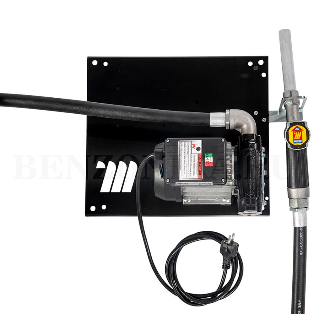 Заправочный блок, оснащённый насосом 220В производительностью 70 л/мин, установленный на металлической пластине для удобного монтажа на стене. В комплектацию входят также антистатический шланг для выдачи дизельного топлива и ручной топливораздаточный кран.