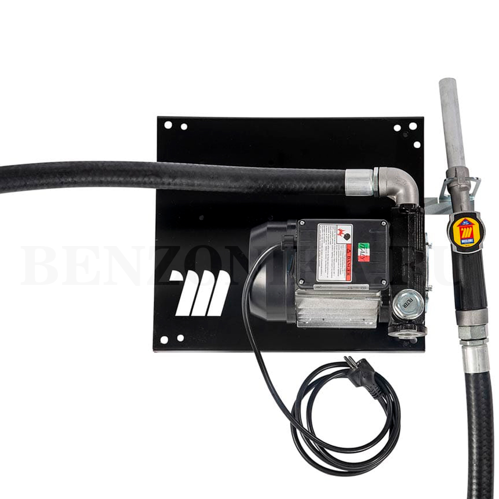 Заправочный блок, оснащённый насосом 220В производительностью 100 л/мин, установленный на металлической пластине для удобного монтажа на стене. В комплектацию входят также антистатический шланг для выдачи дизельного топлива и ручной топливораздаточный кран.