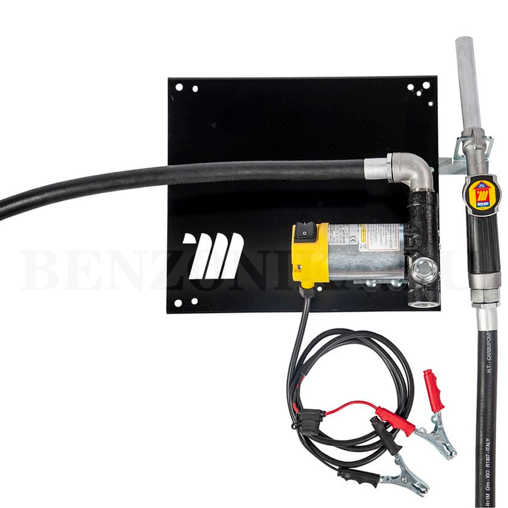 Заправочный блок, оснащённый насосом 24В производительностью 45 л/мин, установленный на металлической пластине для удобного монтажа на стене. В комплектацию входят также антистатический шланг для выдачи дизельного топлива и ручной топливораздаточный кран.