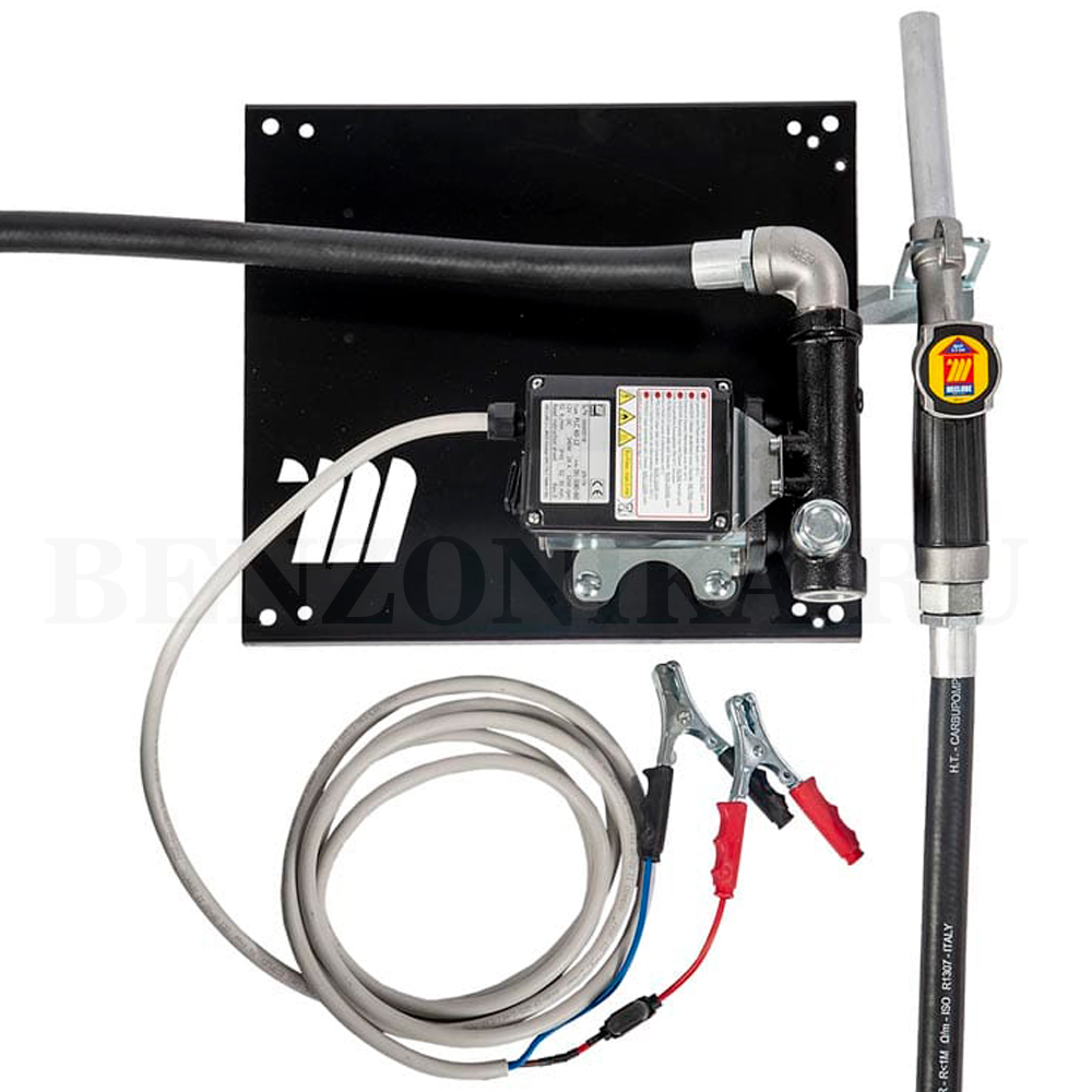 Заправочный блок (Настенный узел "COMPACT" Meclube 090-5044-Y60), оснащённый насосом 12В производительностью 60 л/мин, установленный на металлической пластине для удобного монтажа на стене. В комплектацию входят антистатический шланг для выдачи дизельного топлива (дизеля, дизтоплива, керосина, солярки) и ручной топливораздаточный кран MC100.