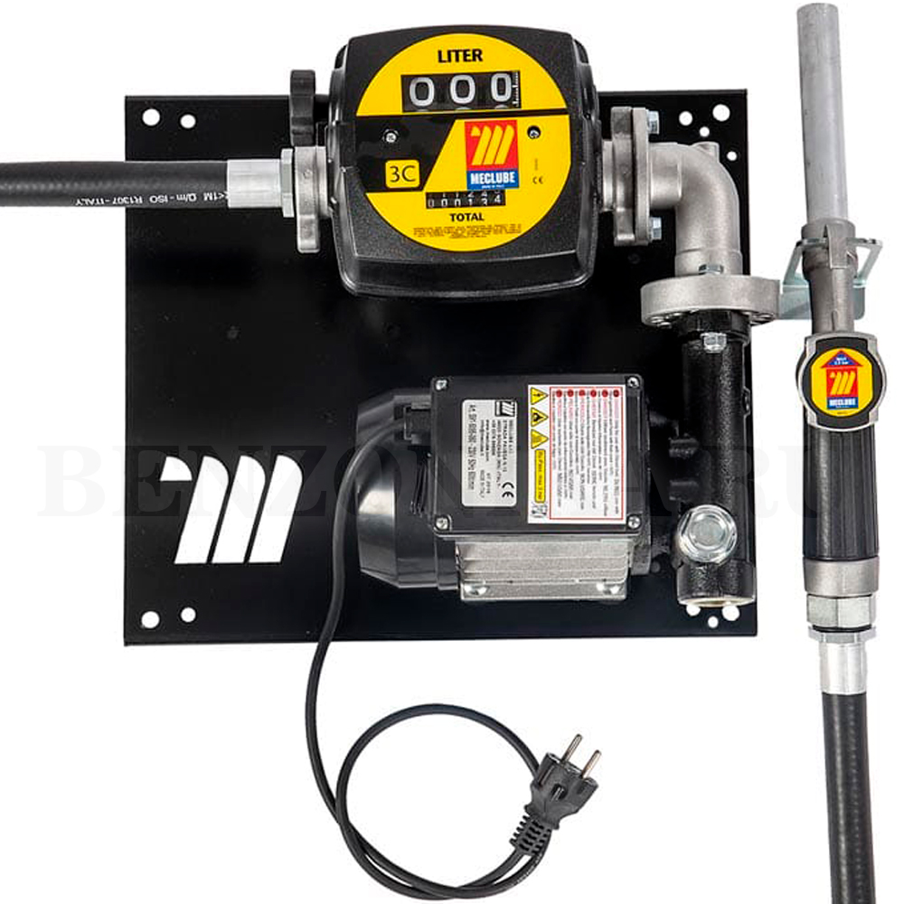 Заправочный блок (Настенный узел "COMPACT" Meclube 090-5046-060), оснащённый насосом 220В производительностью 60 л/мин, установленный на металлической пластине для удобного монтажа на стене. В комплектацию входит антистатический шланг для выдачи дизельного топлива, 3-х разрядный механический счетчик 3C учета дизеля и ручной топливораздаточный кран.