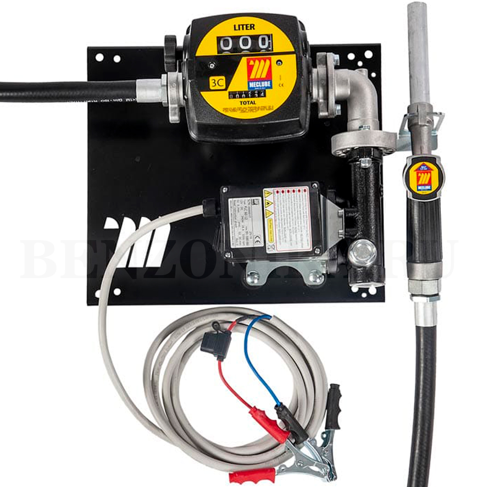 Заправочный блок (Настенный узел "COMPACT" Meclube 090-5046-Z60), оснащённый насосом 24В производительностью 60 л/мин, установленный на металлической пластине для удобного монтажа на стене. В комплектацию входит ручной топливораздаточный кран MC100, счетчик учета дизеля и антистатический шланг для выдачи дизельного топлива (дизеля, дизтоплива, керосина, солярки).