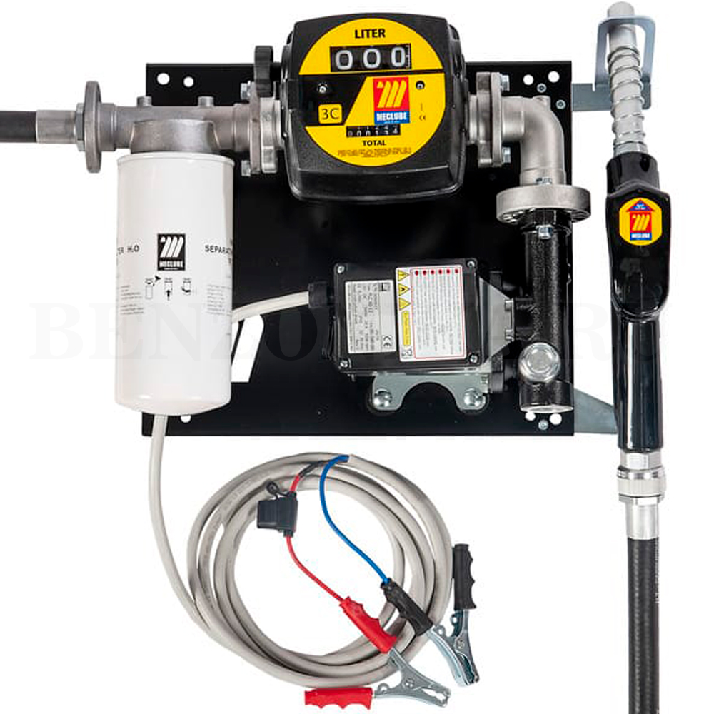 Заправочный блок (Настенный узел "COMPACT" Meclube 090-5047-Y60), оснащённый насосом 12В производительностью 60 л/мин, установленный на металлической пластине для удобного монтажа на стене. В комплектацию входит фильтр-водоотделитель, антистатический шланг для выдачи дизельного топлива (дизеля, дизтоплива, керосина, солярки), счетчик учета дизеля и автоматический топливораздаточный кран PA60.