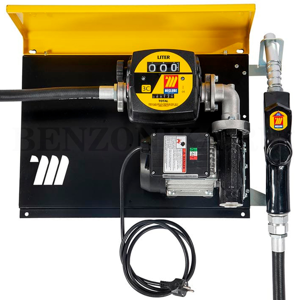 Заправочный блок (Настенный узел "WALL MEC" Meclube 090-5048-100), оснащённый насосом 220В производительностью 100 л/мин, установленный на металлической пластине для удобного монтажа на стене. В комплектацию входит антистатический шланг для выдачи дизельного топлива, 3-х разрядный механический счетчик 3C учета дизеля и автоматический топливораздаточный кран PA120.