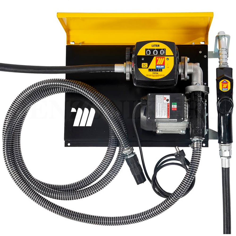Заправочный блок (Настенный узел "WALL MEC" Meclube 090-5148-060), оснащённый насосом 220В производительностью 60 л/мин, установленный на металлической пластине для удобного монтажа на стене. В комплектацию входят антистатические шланги для дизельного топлива (всасывающий и напорный), 3-х разрядный механический счетчик 3C учета дизеля и автоматический топливораздаточный кран.