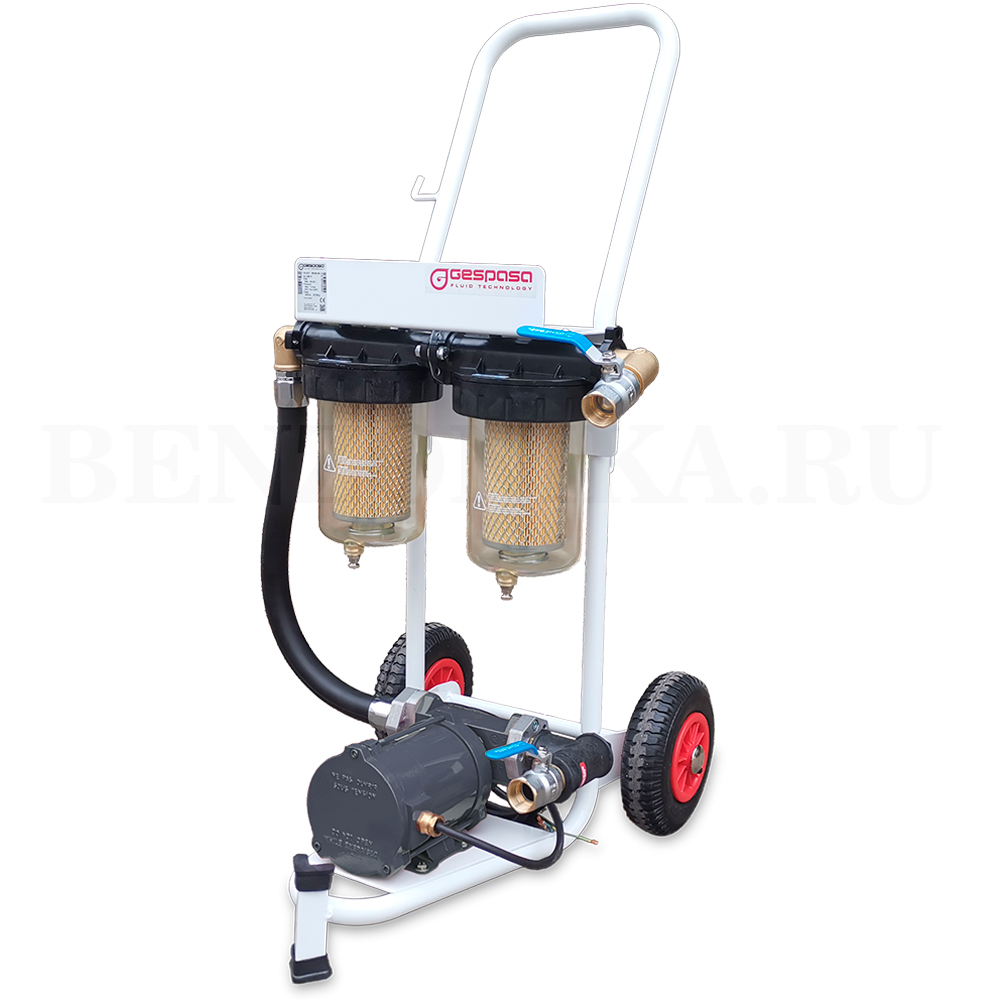 Сепаратор для очистки топлива Gespasa FILKIT EX на базе насоса IRON-50 EX (230 В, 50 л/мин) и двух фильтров FG-100 (25 µm + 5 µm) подходит для очистки бензина, керосина, авиационного бензина, реактивного топлива A-1, дизельного топлива;