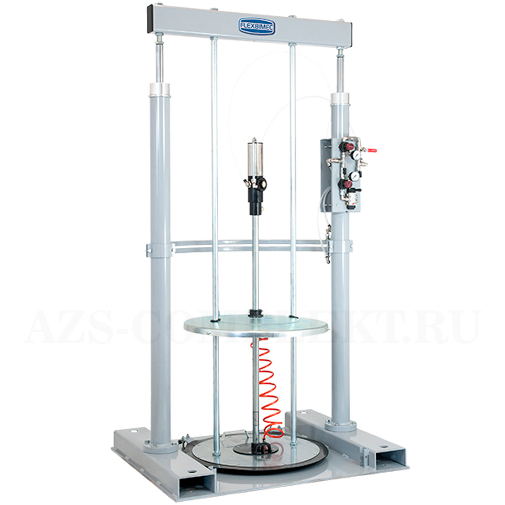 Стационарный поршневой пресс-подъемник Flexbimec 4999/200 для смазки с опорной плитой, состоящий из специального подъемного устройства насоса, подходящего для пневматических поршневых смазочных насосов, системы уплотнения смазки, работающей на основе пневматической схемы, активируемой регулирующим клапаном. Это устройство используется, когда смазка имеет высокую вязкость или очень высокую плотность из-за низкой температуры, и поэтому ее трудно перекачивать.