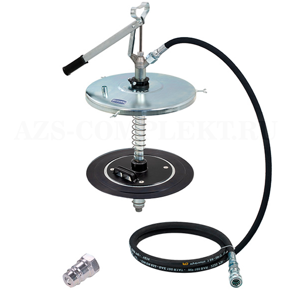 Комплект включает в себя ручной насос, металлическую крышку для бочки, вулканизированную прижимную пластину, резиновый шланг высокого давления длиной 2 метра, гидравлическое быстроразъемное соединение диаметром 1/2 дюйма с резьбой BSP 1/2 дюйма (F) в соответствии с нормой ISO 7241-1 B, арт. № 4237 и арт. № 4237M с резьбой 1/2 дюйма (F). Идеально подходит для смазочных шприцов арт. 4400 - 4400/4 и им аналогичных.