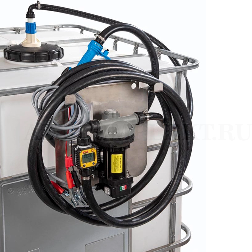 Электрический навесной комплект 12В для перекачивания AdBlue из IBC-контейнеров с ручным раздаточным краном и цифровым счетчиком. Производительность 34 л/мин. Верхнее подключение к ёмкости.