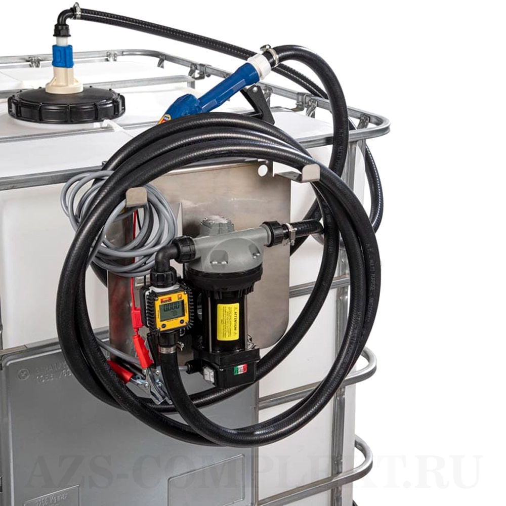 Электрический навесной комплект 12В для перекачивания AdBlue из IBC-контейнеров с автоматическим раздаточным краном и цифровым счетчиком. Производительность 34 л/мин. Верхнее подключение к ёмкости.